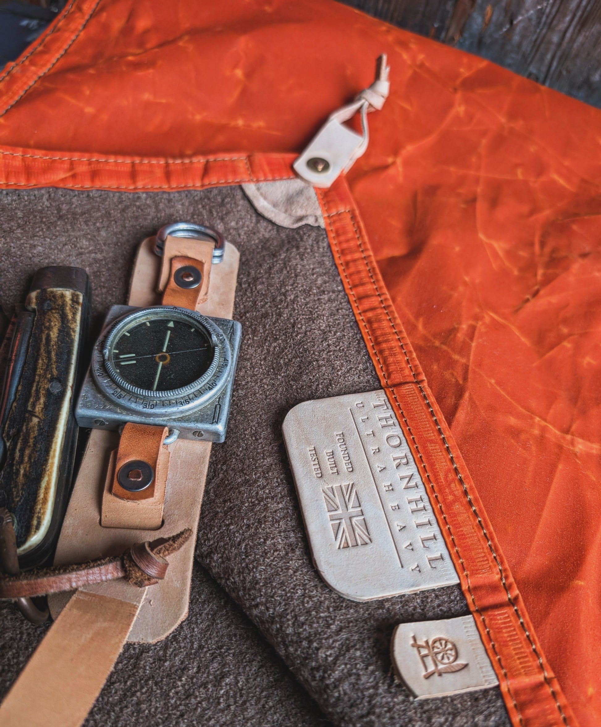 The top side is 415gsm pure boiled wool. The bottom is waterproofed using 8oz P200 Halley Stevensons waxed cotton canvas, so your bum,knees etc will be warm and dry. 6 leather tie-outs - one in each corner plus centres of the long edges means you can peg it to the ground, hang it from a bag or near a fire to dry out. Hand-stamped leather Thornhill UltraHeavy logo patch, because it's pretty.